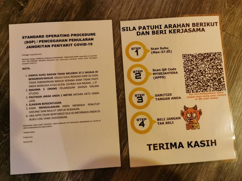Due to the process of MCO we are required to follow certain rules of safety for all. We have some Standard Operation Procedure which we need to do before walk into our premise. Please download MySejahtera apps which you can use to scan before entering our place. We’ve also prepare log book for recording purpose just in case the apps doesn’t work.