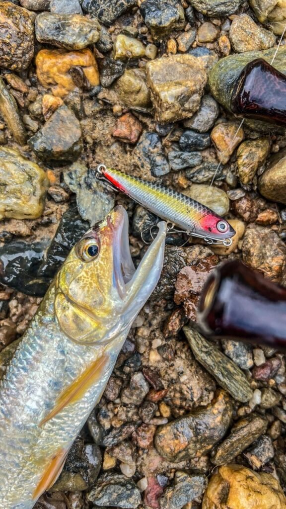 Especially when targeting fast-moving stream species like Sikang (Burmese Trout). His go-to lure is the Cilok-Cilok Pencil Topwater. The surface action is so irresistible that it often gets smashed before it even has the chance to move far!